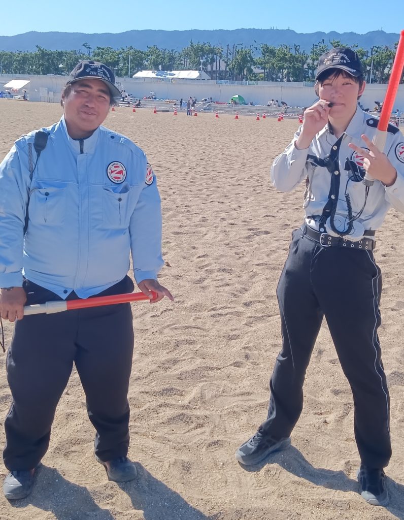 大勢の来場者で賑わう中、若手警備隊員も暑さに負けず、砂浜での立哨を頑張ってくれました。